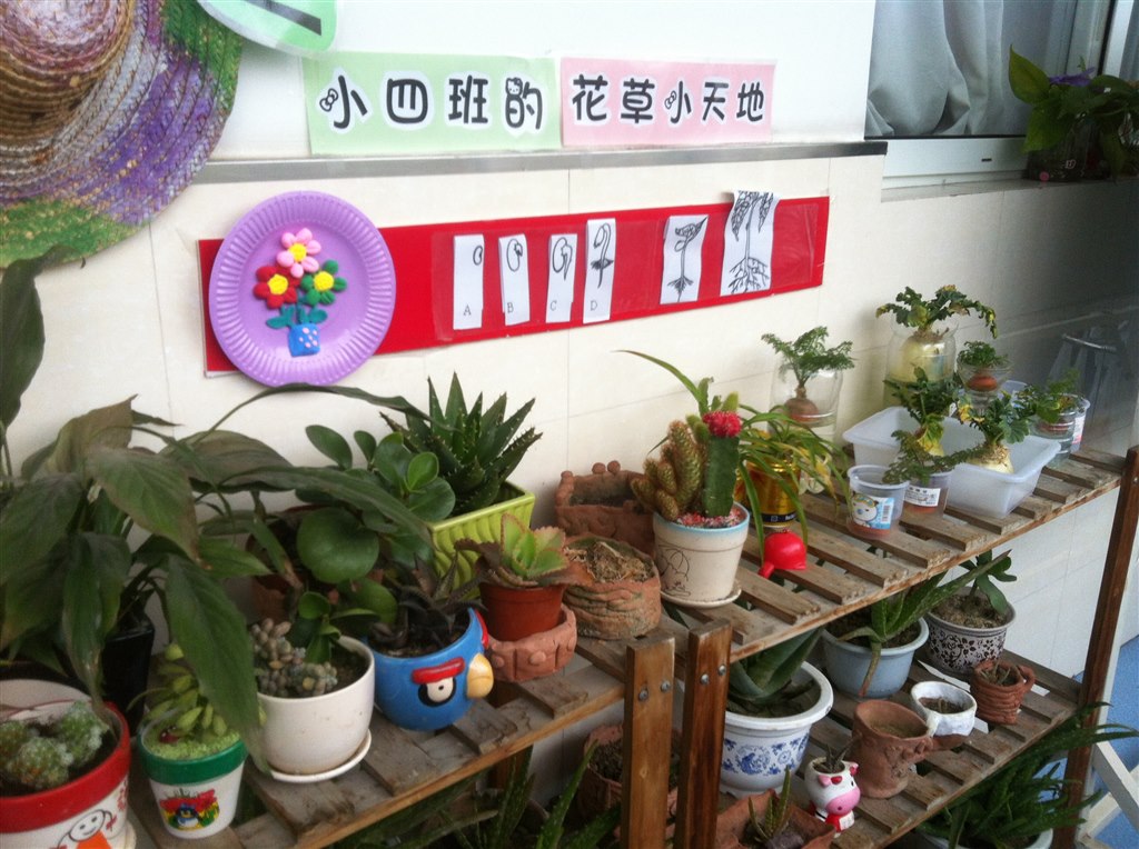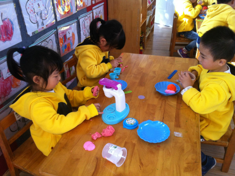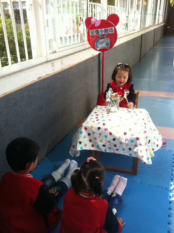 瞧!进门就可以看到笑容可掬的“海绵宝宝”欢迎宝贝们来到幼儿园;可亲的白雪公主给爹妈们温馨提示;鲜艳的彩泥花朵与植物角里绿枝争艳……孩子的玩具也是陶泥自制的呢:陶珠夹夹乐、泥偶小剧场、彩陶点心坊、泥鱼钓钓乐……每一个玩陶游戏都让孩子们乐翻天。