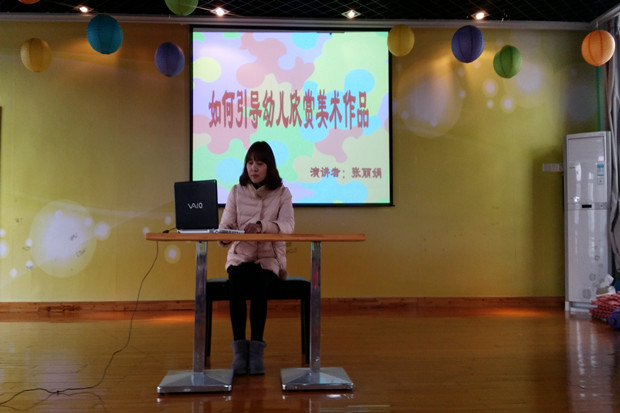 大班张丽娟老师对于“在美术活动中如何引导幼儿欣赏美术作品”进行了指导。在前期准备的过程中听取老师的意见,认真归纳总结;多次与老师们探讨教案;在执教过程中仔细观察每位孩子的课堂反应。研讨中和老师们介绍了自己是如何在教学中解决这些难点并当场施教。
