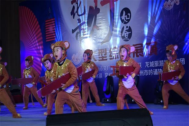 晚上7点,迪诺水镇广场灯火璀璨,游人如织。在第一个节目《红灯笼》舞蹈结束后,孩子们的节目《金猴闹春》快乐开场。“我是金猴,我会舞刀。”“我是银猴,我会板凳。”“好!我们来PK!”两个方阵在作了简单介绍后,纷纷亮出自己的拿手绝活。伴随着铿锵有力的口令声,小金猴们把紫云刀32式、阳湖拳徒手32式、板凳拳32式耍得有板有眼、有模有样,赢得现场千余名观众齐声点赞。