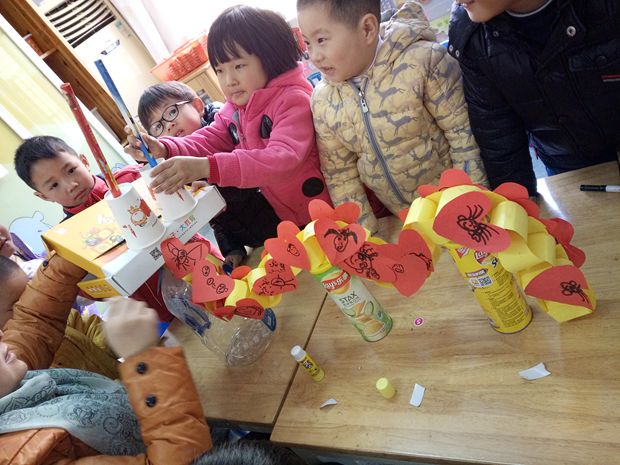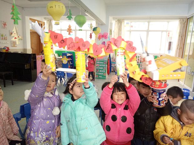 活动中,孩子们首先通过各种途径和方式认识龙的主要特点,然后利用生活周围的各种废旧、环保材料进行造型想象,生生互动、师幼互动做出了具有班级特色的中国龙,体现了乡土化、环保性、艺术性、幼儿的参与性。