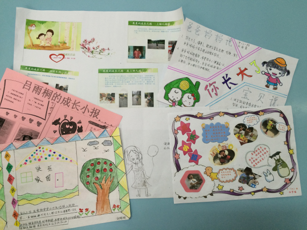本次活动得到了爸爸妈妈们的积极响应,每组家庭都围绕主题进行设计、编辑小报,用生动的照片、美丽的图画、温馨的文字、漂亮的色彩,展示宝贝小档案、爸爸妈妈的风采、甜蜜的全家福、美好的寄语,抒发自己爱的情感。有的亲子小报由孩子做“美工”、爸爸妈妈编写文章来完成;有的亲子小报则以打印文稿为主、色彩鲜艳、图案有趣;还有的亲子小报是纯手绘的,一笔一划都倾注了爸爸妈妈和孩子的心血……