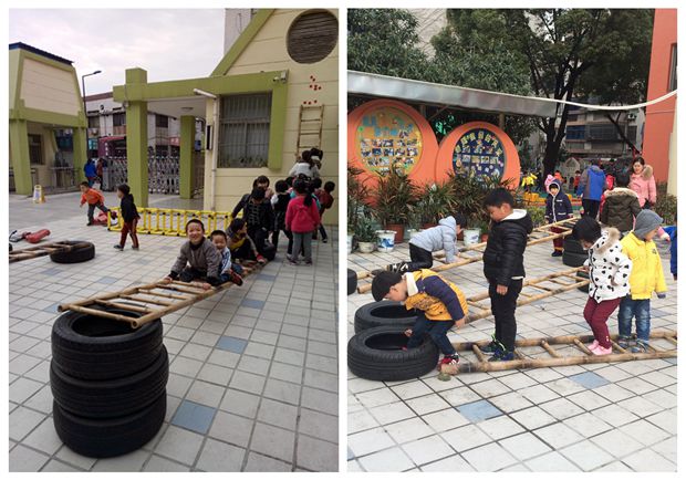 “快,把这个轮胎再放上去,我们要走铁索桥,”“我要三个轮胎,我敢跳”“老师,我要爬梯子,我要玩采摘果子的游戏”……每到周三,孩子们就特别兴奋,因为今天的游戏材料中有轮胎和竹梯,是可以给孩子们自主建构、自由锻炼的。
