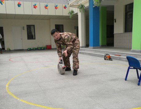 随后,小朋友在老师的带领下,有序地在消防车前站好。亲切的消防员叔叔首先为小朋友介绍了消防员的各种装备,有消防服、消防皮带、消防靴、消防帽等,并还请另一名消防员叔叔现场穿戴全套消防装备。然后给小朋友们讲解了消防车上的装备,让幼儿认识了高压水枪、水带、灭火器等各种器械。