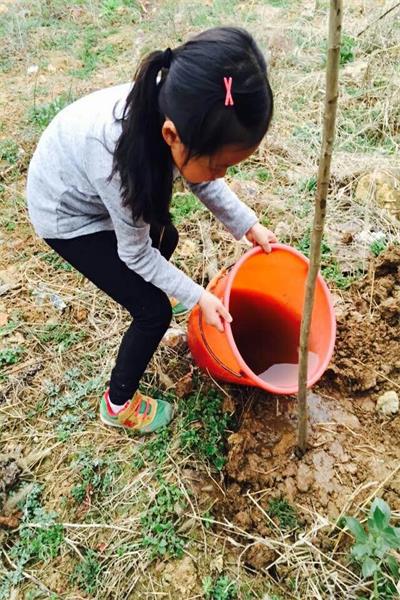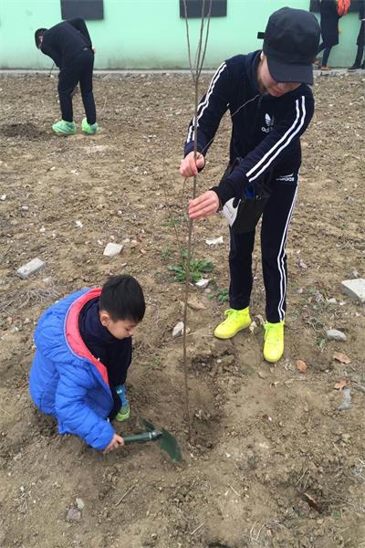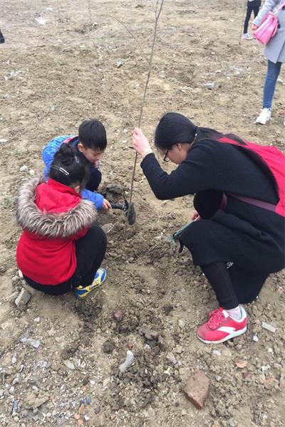 到了目的地,家长们掏出准备好的铁锹、水桶等工具,带着孩子们开始刨坑挖土种树。孩子们分工明确,有的挖坑,有的扶树,有的填土,还有的浇水,很快一排排树苗出现在刚刚还有些空旷的大地上。看着种下的一排排树苗,大家满怀成就感,相约明年再来!