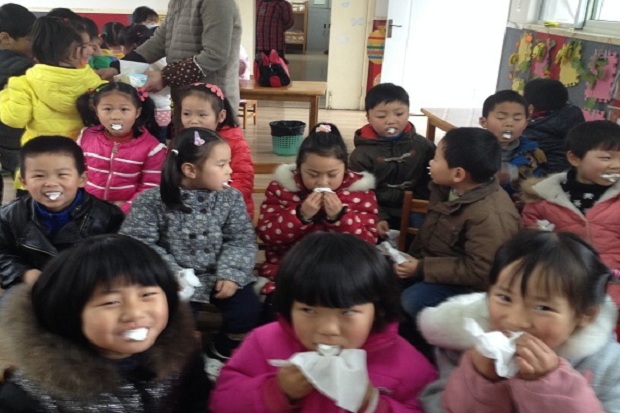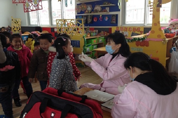 为了使孩子们有一口健康洁白的牙齿,3月15日上午,天宁妇保院儿保科医生来我园开展氟化泡沫龋齿防治活动。在园保健老师的协调下,各班老师早作准备协助区儿保医生对每一位孩子都进行了氟化泡沫龋齿预防。医生一边手拿沾有氟化泡沫的牙托,一边对孩子说:“小朋友,嘴巴张开,我把这个香香的好东西放在你的牙齿上,咬住2分钟,就不会长虫牙了噢!”医生们做完一个班的孩子后还关照老师使用后30分钟勿进食或饮水。孩子们不哭不闹,非常配合,个个争做护牙小卫士。