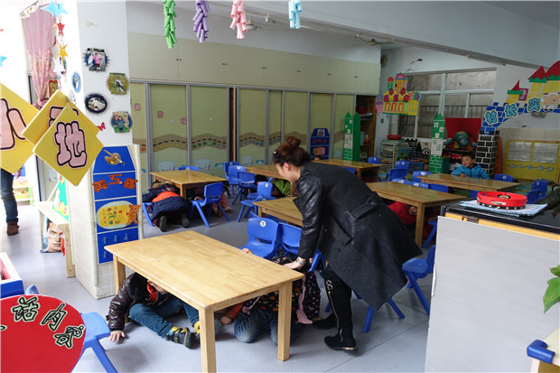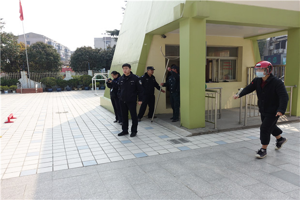 演练活动设置了三个场景进行,一名手持棍子的“危险分子”(男教师扮演)从幼儿园大门闯入操场,听到值班周老师急促的报警哨音,幼儿园迅速启动反恐防暴应急措施。浦秋婷老师安排女教师立即带领幼儿有序跑回教室,肃静,关好门窗,躲藏起来。邱霞老师立即按紧急报警按钮和拨打“110”报警电话。反恐防暴工作领导小组成员与保安一起,就近拿取凳子、梯子以及防暴钢叉与“危险分子” 机智周旋、展开搏斗。保健老师做好现场救护准备。在大家的通力配合下,最终制服“危险分子”。