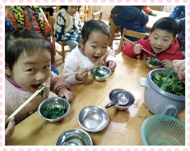 带着劳动的成果、怀着喜悦的心情,大家把挑好的马兰带回了活动室,将马兰进行整理、清洗,老师们把马兰烫熟,用各种调料拌均,香味扑鼻的凉拌马兰出炉了,孩子们争先恐后地分享着,品尝着。小朋友说:“老师,马兰真是太好吃了!”“老师,明天再带我们去挑马兰好吗,我实在是太喜欢春天了!”