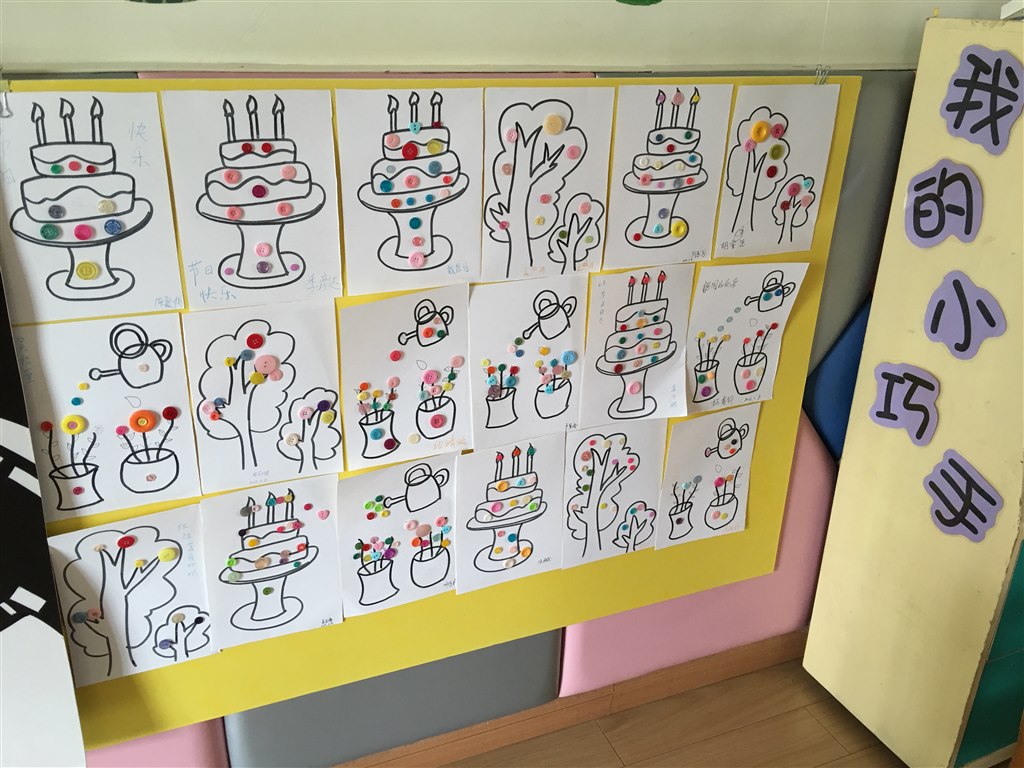 只见他们和孩子一起,你来画底板我来挑纽扣,你来摆图案我来粘胶水,一个一个配合得亲密无间。不一会儿,一幅幅美丽的纽扣贴画就出现了。小花,水桶,大树,蛋糕等等作品形象而漂亮。家长们的才艺和智慧真的让我们深感意外,而孩子们在整个活动中表现出来的耐心和能力更是让我们倍感惊喜。孩子们用这些美丽的扣子在家长的协同下,涂鸦着自己的创意和梦想。