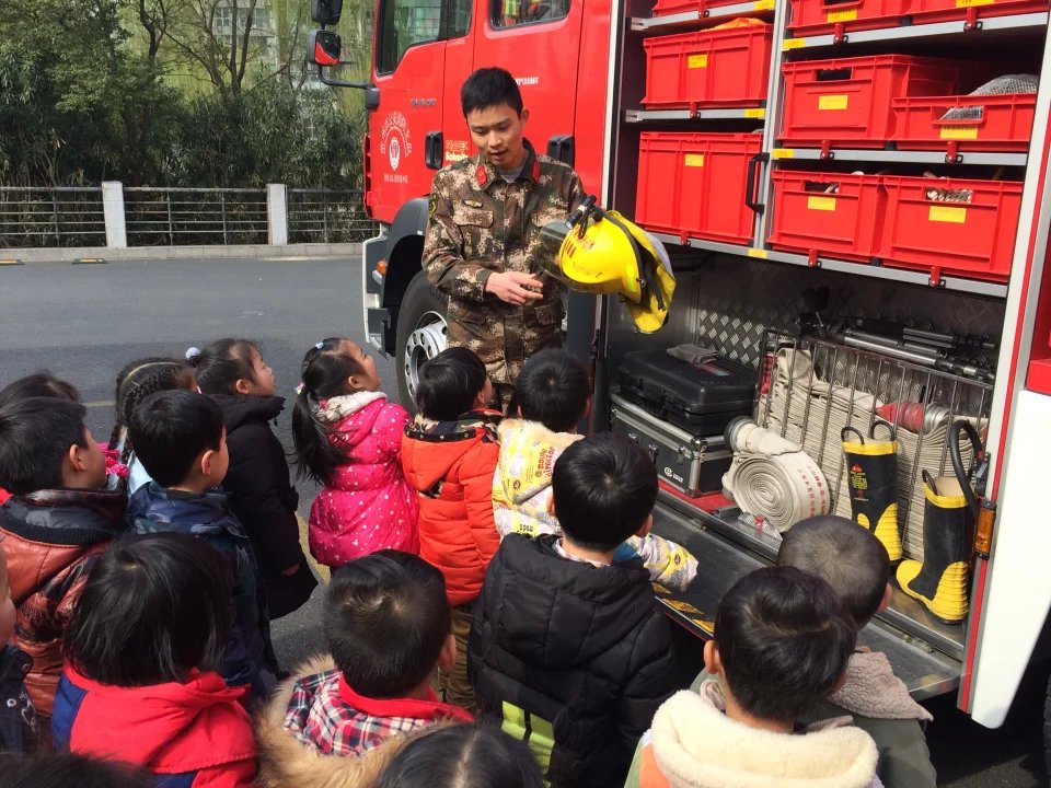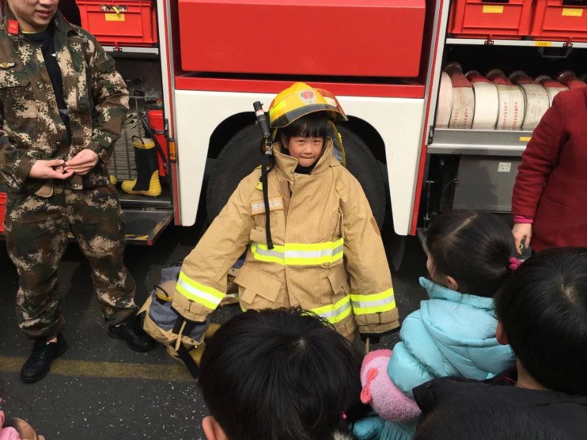 活动中,消防员叔叔耐心细致地为孩子们介绍了各种工具的名称和用途,还带领孩子们参观了他们的宿舍,有的小朋友发出了惊叹声:“你们看,叔叔叠的被子好整齐呀!”看到房间内物品的整齐摆放,孩子们惊奇极了,特意请求叔叔示范怎样叠被子,娴熟的动作赢得了在场所有人的阵阵掌声。最后,在消防员叔叔的带领下,孩子们参观了消防车,小伙伴们都惊叹消防车的神奇。消防车的构造真是很丰富,打开盖子里面有各种的用途,当穿上消防员叔叔的装备时,有的小朋友问:“叔叔,你们穿着这么重的衣服不累吗?”“没关系,不累。”一句简单的回答可以看出我们消防员平时训练的艰辛。