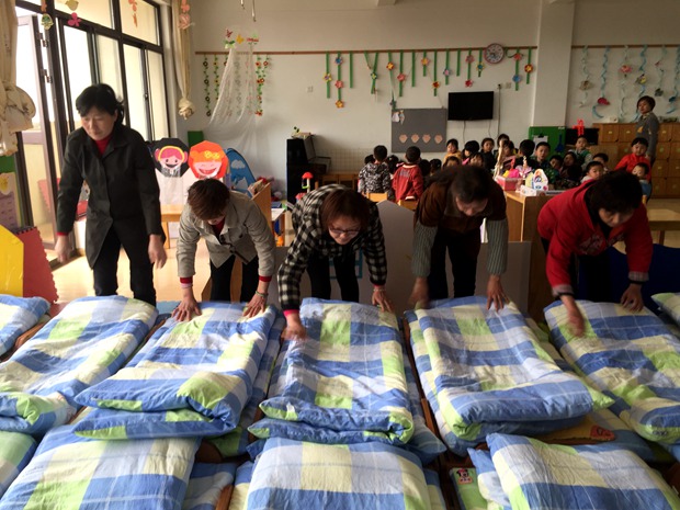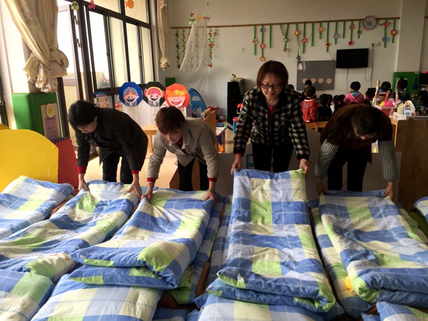 活动前保健老师向保育老师明确了折叠被子的注意事项,如宽度适宜、角挺边直、被褥整齐、床铺美观等。随着一声令响,比赛开始,保育老师们动作娴熟的铺开被褥,两两对折,四角一拉,迅速摆放,一床床平整的被褥就展现在了眼前。赛后,评委对于比赛中存在的问题给予了点评,总结出叠被子时做到“一抖、二折、三拉、四捋”就能快速、规范地整理好床铺,整场比赛在紧张而又热烈的气氛中顺利完成。
