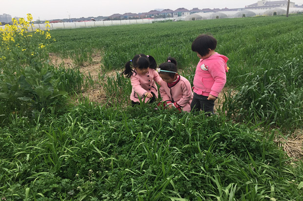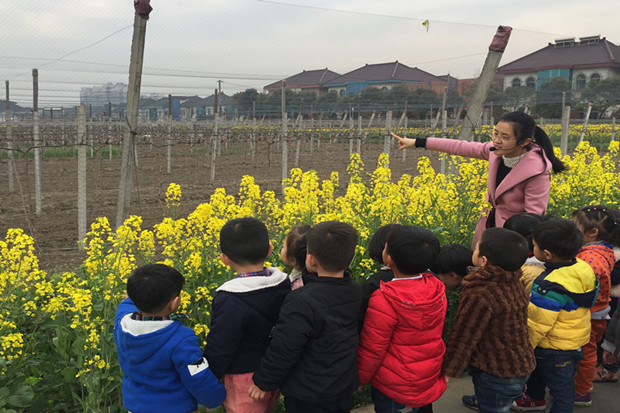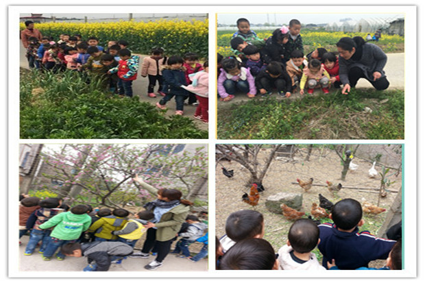 一出校门,孩子们就感受到春天的气息:和煦的阳光、清新的空气、盛开的鲜花……好一派生机勃勃的景象!在老师的引导下,孩子们利用各种感官寻找着春姑娘,沿途的风景,路边的花草,他们驻足在美丽的油菜花前,感受油菜花的芬芳;围在小鸡小鸭的家门口,好像在跟鸡鸭们聊天。他们像一群放飞的小鸟,自由的遨翔在春的怀抱里,享受着春天带来的欢娱。春天在这里,春天在每个角落里,春天在孩子们的笑脸中。