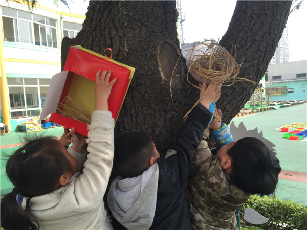 各班老师根据幼儿年龄特点开展不同的主题教育活动,小班幼儿在老师的带领下,学习小鸟的叫声,模仿小鸟的动作,学会了小鸟的歌曲,激发了小班幼儿和小鸟做朋友的愿望。中班幼儿通过课件认识了各种鸟,会讲小鸟的故事,会画出可爱的小鸟,用橡皮泥为小鸟制做鸟巢,激发了中班幼儿保护小鸟的情感。大班通过知识竞赛,让幼儿懂得应该怎样爱护鸟儿,知道爱护小鸟的方法。老师还和幼儿共同搜集各种材料,做成鸟窝,然后找来柔软的枯草放进鸟窝,做成暖暖的小鸟的家,并且给小鸟放些吃的东西,之后全体师生一起在大树上安放鸟巢,用实际行动表达对小鸟的爱护。