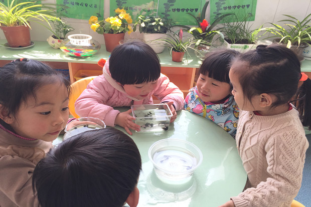 看,小三班自然角里就来了一群新的动物朋友,它们是谁呢?原来是一群圆脑袋、细尾巴的小蝌蚪。孩子们对新朋友的到来可高兴了,他们围在一起观察,讨论。有的说:“小蝌蚪黑乎乎,圆圆的,真可爱。”有的问:“小蝌蚪的妈妈是谁呀?”还有的说:“小蝌蚪长得黑黑的,它没有大眼睛,绿衣裳,也没有四条腿怎么会是青蛙妈妈的宝宝呢?”他们讨论得非常热烈,几只看似寻常得不能再寻常的小蝌蚪,在孩子看来,却藏着如此多的秘密。他们好期待小蝌蚪长大变样的过程,这激励着孩子们带着疑问主动去观察和发现,小小自然角俨然就成了孩子们探索大自然的小天地。