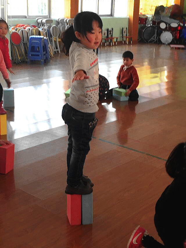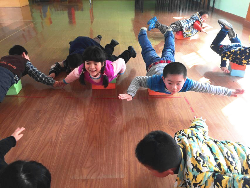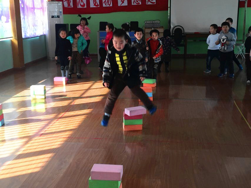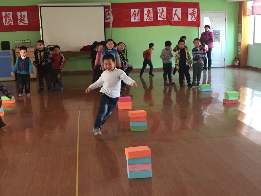 首先,老师们根据实际场地、借鉴民间游戏进行改编和创编,确定了一系列有趣好玩的运动游戏,如利用泡沫砖站立,锻炼幼儿的平衡感;又或者趴在泡沫砖上锻炼腰腹部力量;最后,孩子们自己利用泡沫砖摆出了一系列可用于奔跑或跳跃的障碍,玩得不亦乐乎。再次,老师们在指导中多采用平行游戏、鱼贯练习等活动方法,以达到适宜的活动量。