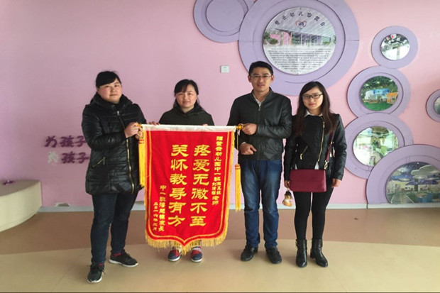 一个月前的一天中午,孩子们正常结束完午间散步准备睡觉之际,潘旭楠小朋友突然倒地开始抽搐起来,同时口吐白沫。在班的三位老师临危不乱,分工合作,一个按照急救要求对潘旭楠进行急救,另一个开车送潘旭楠去医院。由于及时进行处理,潘旭楠小朋友安全度过危险期。小朋友的家长表示,锦旗虽轻情谊却重,这一面锦旗并不足以表达家长对老师们的感激之情,老师们关爱孩子的精神和崇高的师德将一直影响着孩子们的成长,这面锦旗便是对老师们辛勤工作的极高肯定。