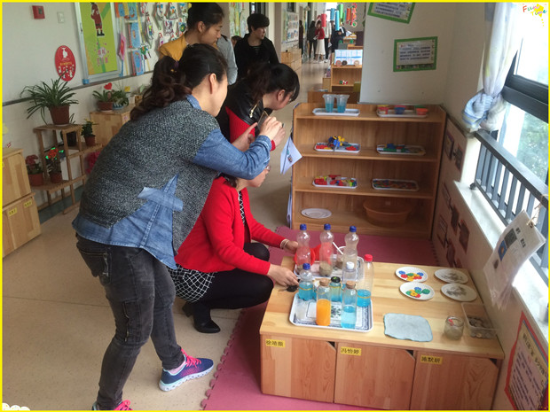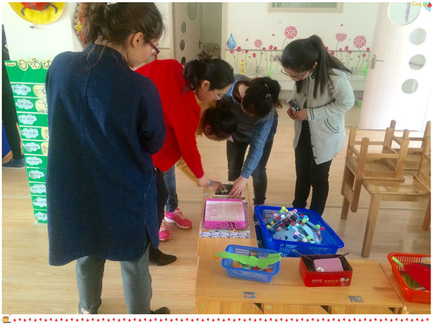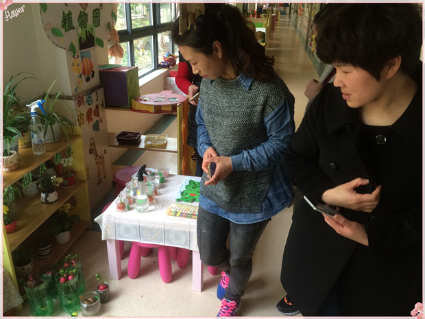 该园的束佳老师带领姐妹园的同行们对整个园所的环境进行了参观,并对每个班级的环境特色进行了详细讲解。幼儿园的整体环境创设的动态性、创意性、情景性、开放性给大家留下深刻的印象,处处可以看到教师、孩子们的创意作品、共同自制的学习游戏器具等等。观摩的老师们不断用照相机记录下一个个精彩的画面。在参观中,大家不断讨论着、思考着、交流着……