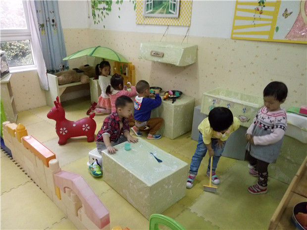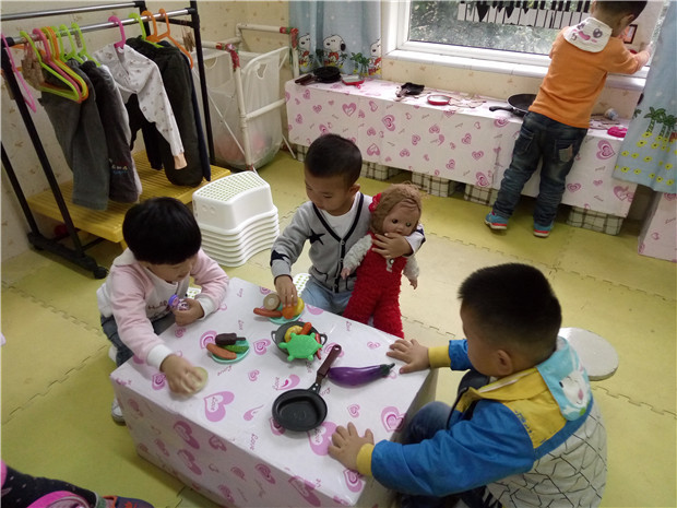 为了有效推动小班娃娃家游戏的开展,促进教师对游戏的深入观察,提高幼儿在游戏中的自主交往能力,根据小班幼儿的生活经验,老师们为幼儿创设了孩子们非常喜欢的、温馨的 “娃娃家”环境,他们可以在娃娃家中无拘无束尽情地运用自己的已有经验进行游戏。游戏中他们互相学习如何到别人家里去做客(先敲门问家里有没有人);如何热情地招待客人,有的幼儿独自在游戏;有的幼儿三三两两地在游戏;有的幼儿会运用自己已有的生活经验模仿一些成人的动作,如:烧饭、切菜、抱娃娃……幼儿在游戏中,互相模仿,积极交流,共同合作,从中得到了快乐与满足。