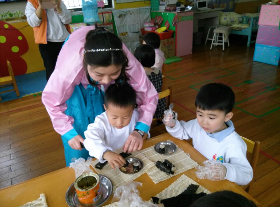 为了使本次活动开展得更有声有色,家长妈妈提前做了充分的准备,首先结合赴韩国考察的机会,准备了具有韩国传统特色的服饰,活动中,身着韩服的家长妈妈给孩子们介绍了韩国发展史、韩国的著名建筑,还在现场亲自制作了紫菜包饭,孩子们一边品尝着美味的韩国佳肴,一边尽情地享受着家长带来的丰富多彩的活动,个个乐得合不拢嘴。