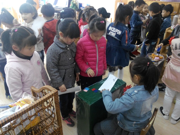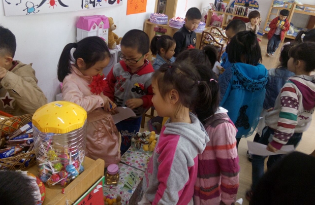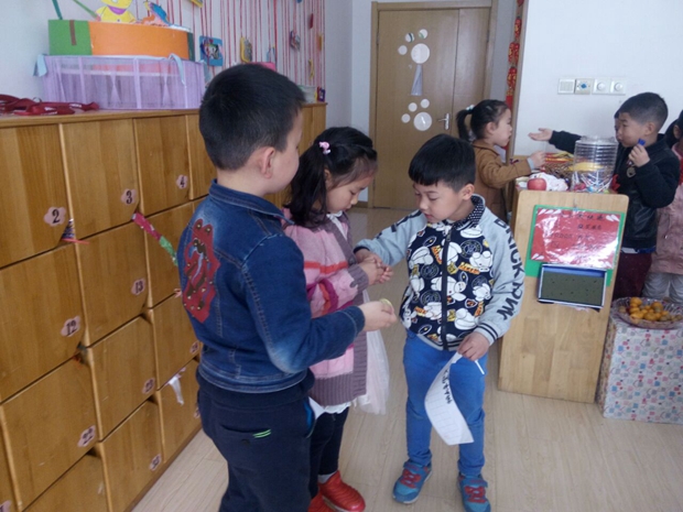 游戏币是连接各区域的纽带,老师会根据孩子们在日常生活中的表现用奖励金币的方式激发孩子们学习的热情,可以通过完成“任务卡”上面的任务获得金币,也可以在各区域“打工”挣得“工资”。幼儿手中有足够的游戏币的话,可以去超市购物或挑选心仪的礼品;也可去“银行”,把多余的游戏币存入“银行”,下次来还能接着用。其次,每次消费我们都会在积分卡上盖章,根据积分卡的数量兑换奖品以此作为孩子们进行活动的奖励。新游戏规则的建立让孩子们充满了浓浓的诱惑,他们纷纷高喊:我也要打工!