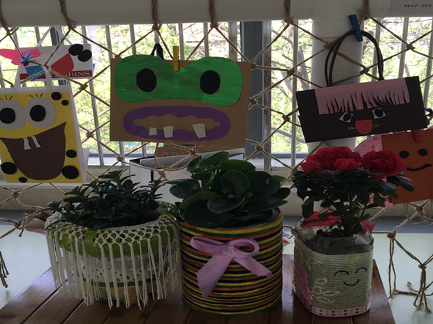 废旧纸盒、树枝……面对一些废旧的材料,爸爸妈妈和孩子们俨然成了设计师、魔术师,他们仔细地推敲着搭配各种各样的材料,有的剪、有的画、有的粘、忙得不亦乐乎。经过一番努力后,废旧材料华丽变身,瞧,环保袋变成了漂亮的面具,纸盒变成了小汽车,各种塑料瓶装饰好住进了植物……一件件的创意品,让孩子们体验了变废为宝的成就感。