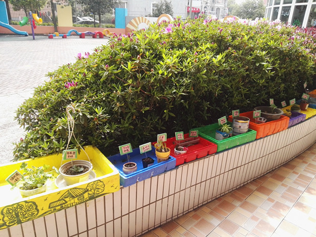 在老师们的精心绘制下,一个个白色的泡沫盒子变成了彩色的大花盆,花盆上勾画出各种有趣的图案,然后,把孩子们种植的花草放入其中,连成一片,一下子让自然角变成了美丽的花圃。孩子们每天来园都会饶有兴趣来到植物角,关注自己花圃中种植的花草种子,给它浇浇水,说说话,并且观察自己的种植的种子生长的过程。