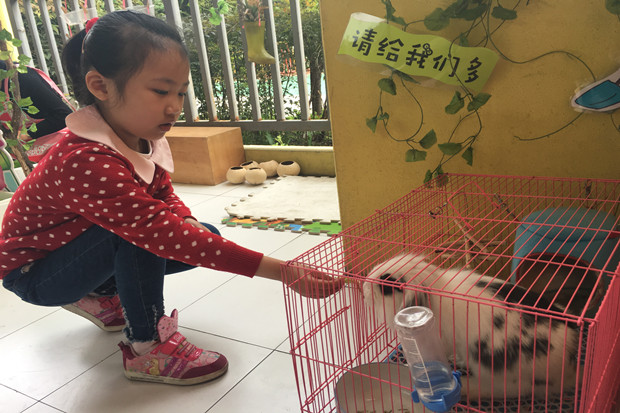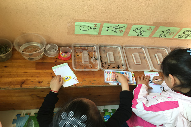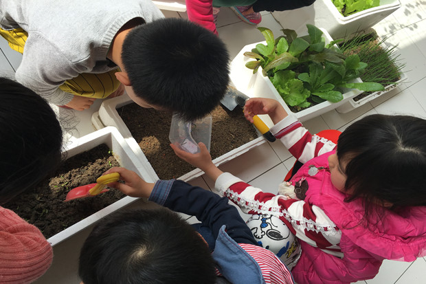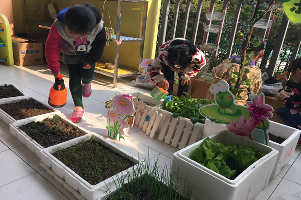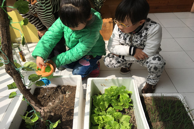 孩子们对植物角里的动植物都很感兴趣,蹦蹦跳的兔子、游来游去的小蝌蚪、爱吃桑叶的蚕宝宝成了孩子们的朋友,他们常常会经常和这些朋友说悄悄话。小菜园里面也是一片生机盎然的景象,绿绿的青菜、高高的莴苣、爬藤的丝瓜、卷卷的生菜,以前只有在饭桌上看到的蔬菜,现在离孩子们是那么的近,真正地是体验了一回当“小农夫”的乐趣。孩子们开始尝试自己照顾动植物,每个小组有自己负责的区域,承担一定的劳动任务。谁浇水、谁喂食、谁记录,这些都是孩子们自己商量的。