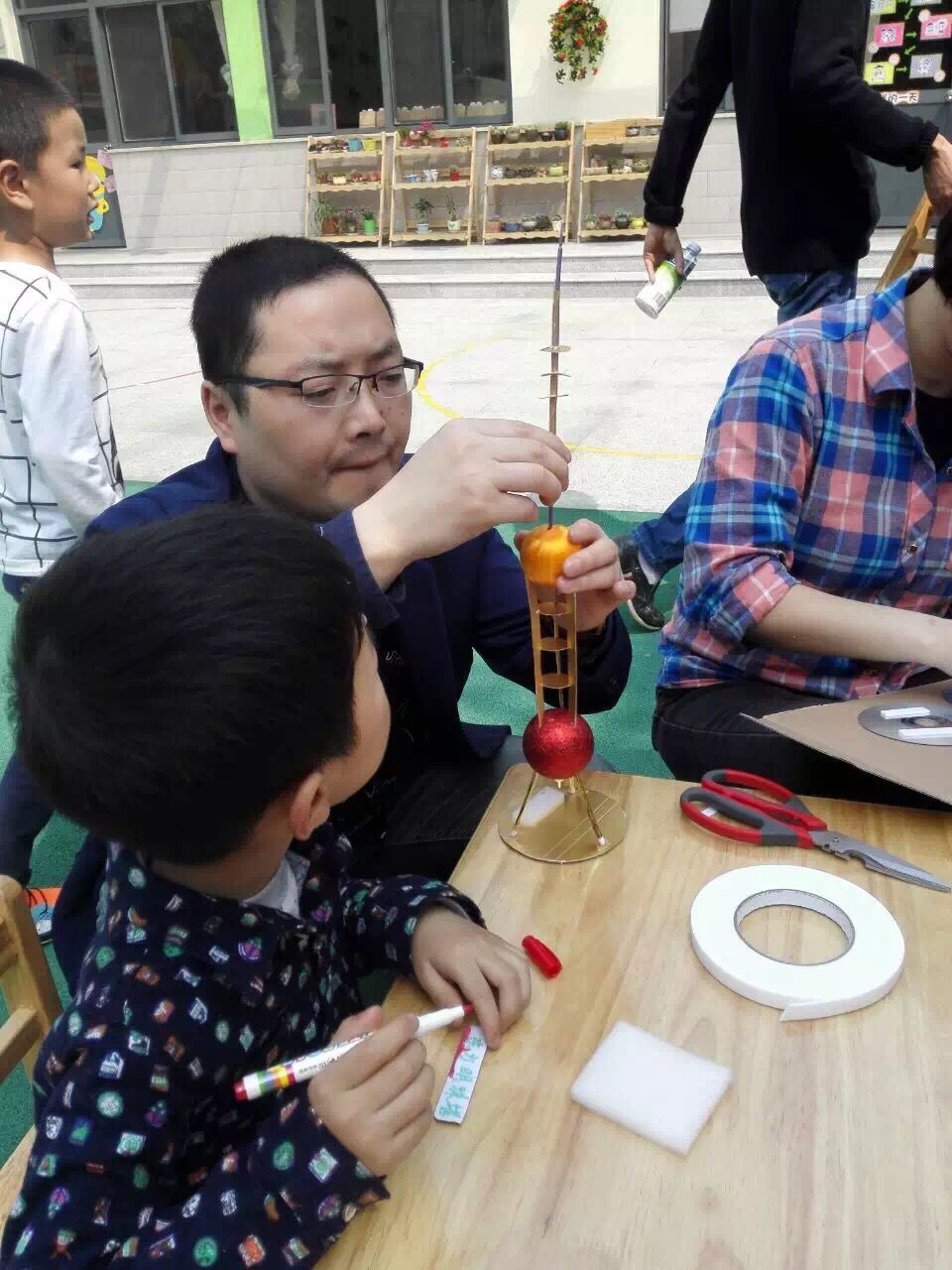 期待已久的环保制作终于拉开了序幕!家长和孩子们有序的来到操场上,拿出自己事先准备好的材料认真的制作起来……