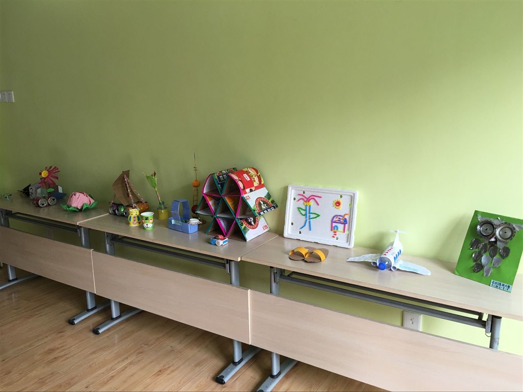 他们利用各种废旧材料设计制作出了各种各样丰富多彩的手工作品。如:用装鸡蛋的托盘制作的《毛毛虫》;一次性筷子、易拉罐制作的《帆船》、《鸟的天堂》;废旧的塑料袋套制作的《连衣裙》《花篮》等系列作品;旧纸盒制作的《收纳盒》《房子》还有用废旧泡沫球做的《东方明珠塔》等等:一件件变废为宝制作的生动形象的作品,设计新颖、构思巧妙,易于操作。不仅融入了新世纪幼儿园绿色环保、健康、文明、节约的生活理念,进一步丰富了幼儿区角活动内容,同时也对家长和孩子们的动手操作能力、创造性思维能力、探究能力的提高起到了积极地促进作用。