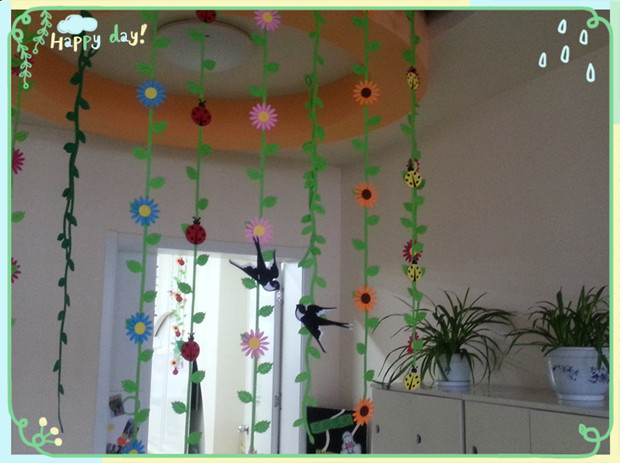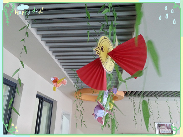 瞧!栩栩如生的“柳条”“桃花”,翩翩起舞的“小燕子”“小蝴蝶”,形象逼真的“小蝌蚪”“小蜜蜂”,花园般的室内尽展着春的清新和美丽,洋溢着春的气息和生机,营造出一个温馨舒适、整洁灵动的“家”的感觉。