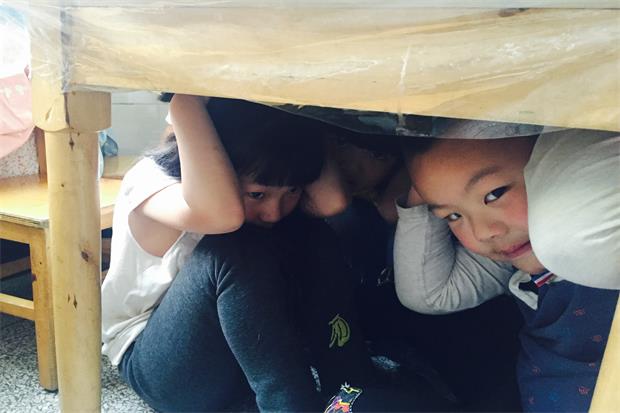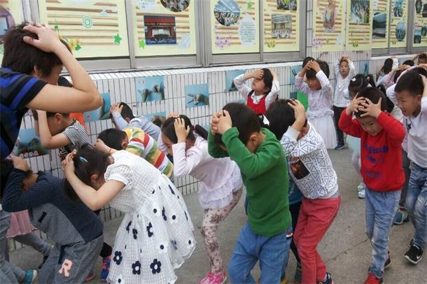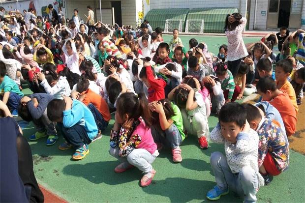 演练前,各班老师就地震灾害发生时的自救常识对孩子进行了安全教育。下午三点,急促的警报声在园内响起,老师迅速指挥孩子们双手护头蹲在指定位置就地避震;听到第二次警报声后,各班孩子在教师、保育员阿姨以及保安的指挥下,分别从各自的活动室迅速、有序地按预定疏散路线撤出教学楼,疏散到幼儿园操场上。全园教职工分工明确,各司其职,整个疏散演练活动紧张有序,从防震报警声响起到幼儿全部集合到避险场所用时不到五分钟。