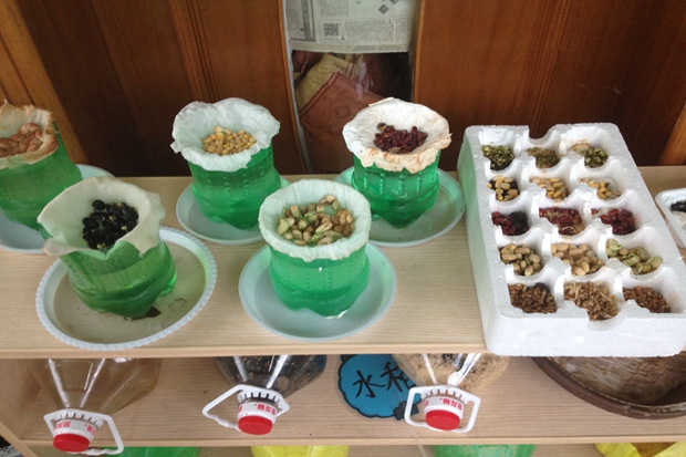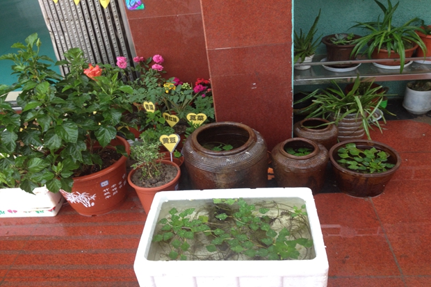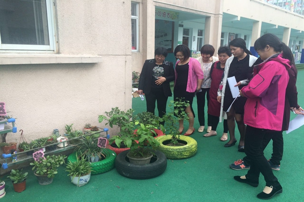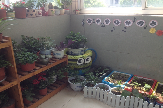 在各班教师和幼儿的精心培育下,种植角散发着浓浓的生命气息,吸引着每一个孩子去发现、去探索。小班的自然角中,可以看到饲养的小动物,充满童趣的爱心小插卡;中、大班的自然角似乎变成了实验种植园地,老师们用饮料瓶、蛋糕盘子、牛奶盒等各种废旧材料制作“生长基地”,进行着各种根的观察、植物吸水性的实验、种子发芽的实验。