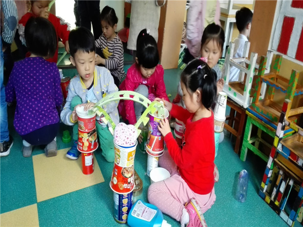 教师围绕“低结构主题活动”进行头脑风暴,教师们纷纷提出了自己对于低结构材料、活动的理解和做法。在进行了思维的碰撞之后,各班教师结合不同的观点和看法,根据幼儿年龄特点在各自班级进行了低结构活动的实践。有的教师在园门口建立环保收纳箱,让幼儿园所有的家庭都有这样的一个收集与参与的意识;有的教师在班级里提供了盒子、绳子、筷子等材料,让幼儿通过各种观察、比较,尝试用多种方式进行测量;而有的教师则将低结构材料投放入建构区、艺术角内,幼儿利用各种低结构材料进行想象与创造。