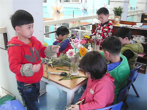 接着,孩子们就开始忙碌起来,一会儿修剪、一会儿整理、一会儿分配花朵和叶子,宛如一个个插花艺术家,活动现场弥漫着淡淡的花香气,枝叶飞舞,剪切下来的枝、叶、花,在灵巧手指间成了最佳素材,原来空空如也的花瓶变成了一盆盆造型各异的花的艺术品。