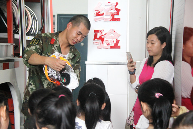 获奖幼儿从消防员叔叔的手中拿的了他们的奖品——仿真消防车,孩子们开心极了。接下来,是让孩子们最为期待的时刻,那就是参观消防中队。孩子们跟着消防员叔叔参观了消防车,了解消防设备。孩子们还动手感受了消防设备的重量,以及消防设备的安装。