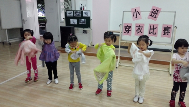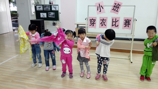 针对目前家庭教育的情况,很多孩子在家是家中的“小皇帝”、“小公主”,很多事情都是家长帮办代替,导致了这部分孩子的自理能力相当差,几乎就是“饭来张口、衣来伸手”。结合小班幼儿的年龄特点,让幼儿知道自己的事情自己做,不要爸爸、妈妈帮忙的习惯,小班年级组选择了适合小班幼儿学习的生活活动比赛——穿衣服比赛,让幼儿通过比赛对穿衣服增添信心。