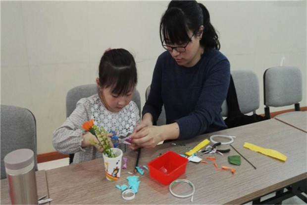 孩子们一进门就被桌子上摆放的五彩缤纷、生机勃勃的纸艺“波斯菊”引住了目光,朵朵波斯菊栩栩如生、惟妙惟肖,让人爱不释手。“红山茶”志愿者老师热情、细致的讲解纸艺花的制作过程,带领大家快速融入DIY氛围之中。活动期间老师、孩子们频频交换意见、相互请教,制作过程中创意不断,大大活跃了气氛。
