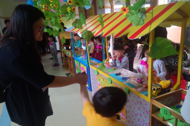 大家把搜集过来的闲置儿童用品(玩具、图书、饰品、手工制品等)摆放在属于自己的“格子铺”中,和家长商量着商品的价格,确定好价格后贴上标价开始叫卖:“快来买呀,快来买好玩的玩具呀”,叫卖声吸引了一波又一波的顾客。