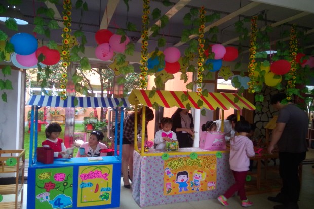 教室里的“手工DIY商店”也热闹非凡,小小的自助收银台前整齐的排着队伍,大家拿着硬币自助购买手工材料包进入教室进行手工DIY活动,做好的作品还可以拿出去叫卖,真是一举多得呢。