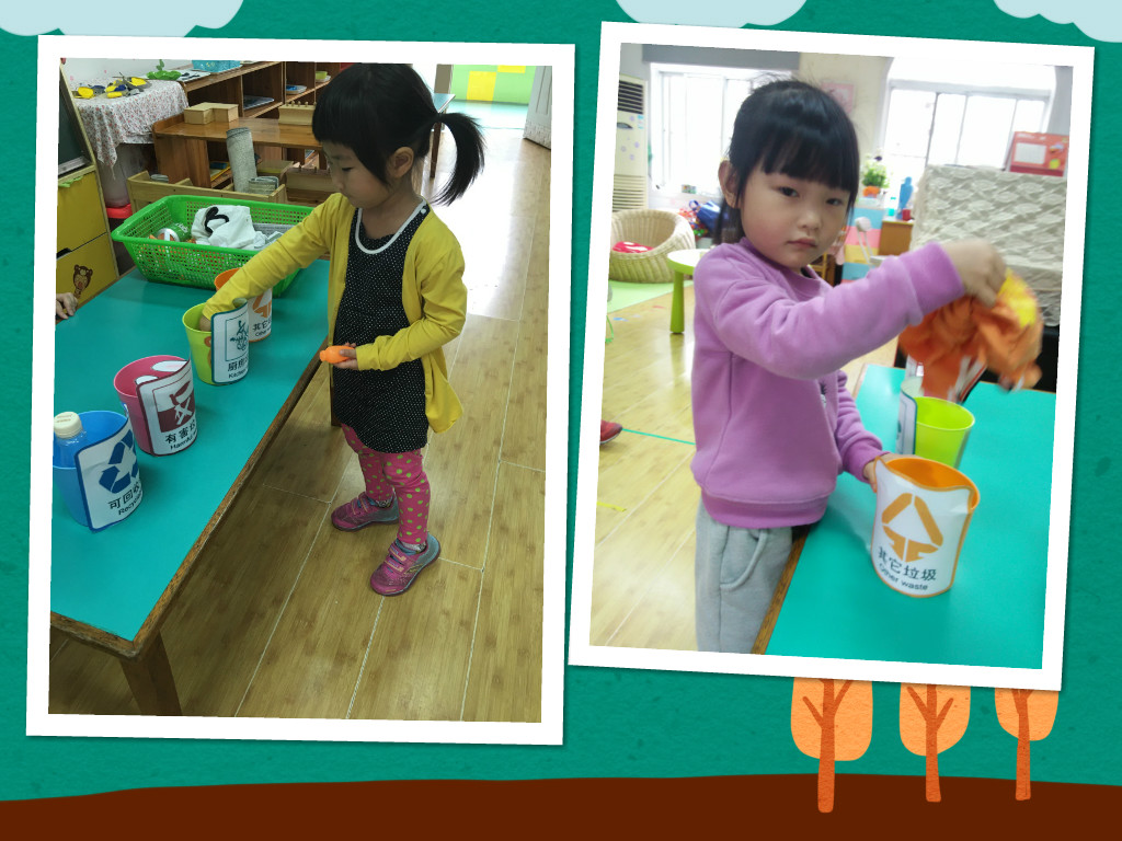 近日,我们花苞苞便班开展了“世界环境日,四色垃圾我认识”的主题教学活动。用卡通图片、课件视频的形式,让我们的孩子知道了不同颜色的垃圾桶代表不同形式的垃圾,不同的垃圾要放入不同的垃圾桶,学会垃圾分类,学会环保,学会爱护我们的环境。并请我们的小朋友做一做“分类小能手”,给每个垃圾都找到了自己的“家”,有的帮小衣服找到了橙色的“其他垃圾箱”的家,有的帮小萝卜找到了绿色的“厨房垃圾箱”的家等等。经过这次活动后,小朋友们不仅知道了垃圾需要分类回收,更从游戏中知道了保护我们环境的重要性。