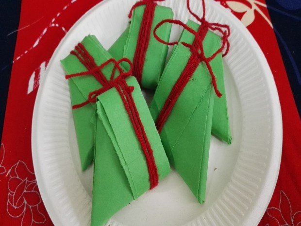 首先,把家长请进课堂,做起了孩子们的“巧手顾问”。“先把粽叶折成小漏斗,然后把糯米放进去……”“每两根绳子系一起……”瞧!在活动现场,家长一边认真地操作一边给小朋友讲解包粽子以及编织香袋的每一个步骤。