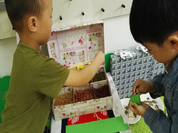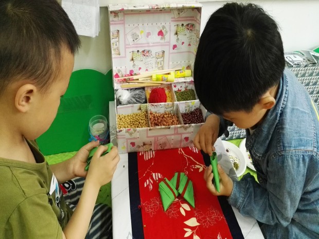区域活动是孩子们进一步探索、操作、学习成长的好去处。瞧!孩子们在摆弄材料的过程中,一遍又一遍的尝试,“粽叶”散了,重叠;“米”撒了,重灌;绳子绑不住,请朋友或老师帮忙……孩子们耐心、坚持、专注、乐观、不怕失败的学习品质得到了进一步的提升。另外,游戏的重复进行可以为孩子提供充分的锻炼机会,带来更多的乐趣。