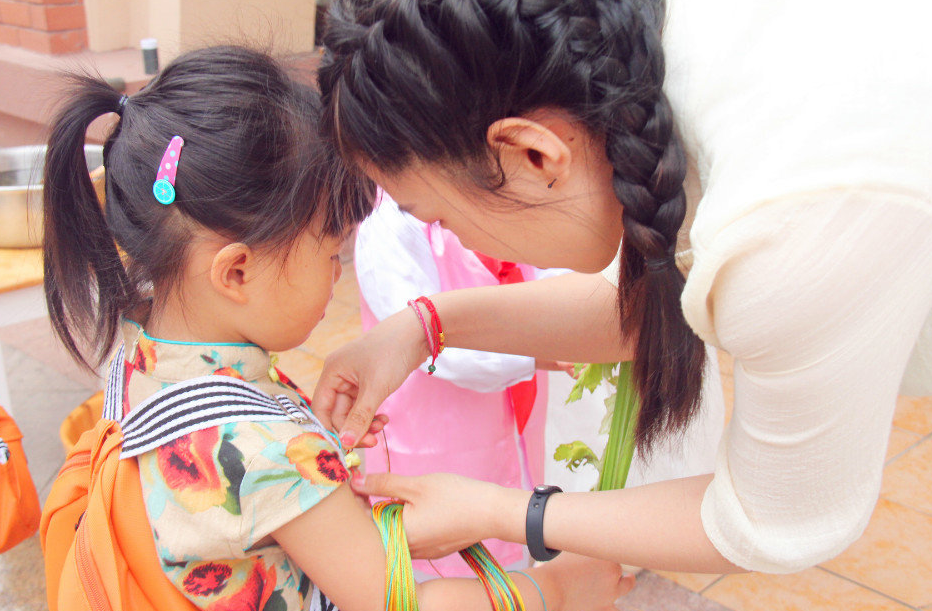感知端午——“五月五,是端阳” 瞧,小朋友们都穿戴上精心准备的汉服“穿越”来园啦,和爸爸妈妈一起体验古风雅韵:他们正在用艾叶净手,老师为孩子们系五彩绳,园长妈妈给每位宝贝用雄黄酒轻点额头、手心,寓意健健康康、长命百岁。老师们通过讲故事、看视频、颂诗赋等形式的讲解,让孩子们了解端午节的来历及习俗,知道端午节是为了纪念爱国诗人屈原,萌发初步的民族自豪感。