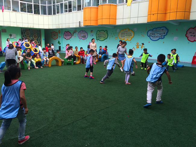 运动中兴趣对于幼儿来说极为重要,而足球对来孩子来说有着与生俱来的吸引力。老师们先通过观看视屏、图片、游戏活动等来让幼儿感受和体会胜利的喜悦与成功的荣誉感,并认识了解足球。有了兴趣之后老师就教幼儿一些简单的方法和技巧,如:脚弓、脚尖、脚背的位置在什么地方,传球应用什么位置?带球怎么带?停球用什么位置?身体的什么位置不能碰球等等!