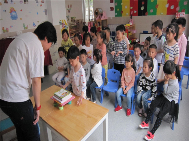 实验一开始,陈姿玥妈妈便在桌上转起了鸡蛋宝宝,孩子们顿时傻了眼,大家你一句我一句,怎么鸡蛋不破呢?大家争先恐后的上来要尝试一下。接下来的实验更让孩子们目瞪口呆,只见陈姿玥妈妈拿起一个鸡蛋放进装满水的盆子里,这时发生了奇怪的一幕,鸡蛋居然浮在了水面上,孩子们一阵惊讶声和欢呼声,陈姿玥妈妈同样又做了一个沉的实验,更是激起了孩子们探索的欲望,纷纷跑上前询问原因。最后陈姿玥妈妈拿了四个鸡蛋分别放在彩泥上面,一本一本把书压在鸡蛋上,一本没破,两本,三本,四本,鸡蛋依然没破,这时教室里已经欢腾起来,响起了雷鸣般的掌声,活动再次掀起了高潮。