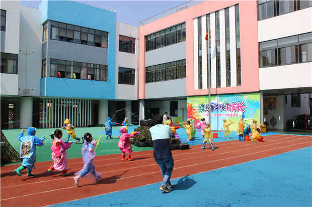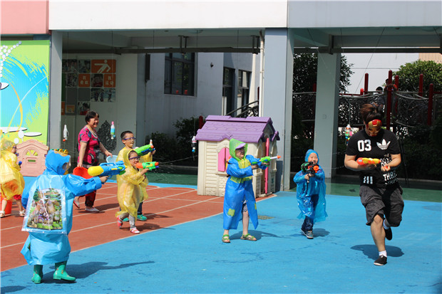 在水枪大战中老师加入到孩子们的队伍中,像做战指挥官一样率领着小朋友们尽情地开展玩水游戏,孩子们紧紧地围在老师身边保护着最最亲爱的老师,生怕在做战过程中受到“伤害”,有了孩子们的保护,可爱的老师更加英勇做战,水声、喊声、笑声混成一片,大家玩的不亦乐乎,沉浸在玩水的乐趣中。当一串串水柱喷射天空,当身着五彩的雨衣的孩子奔跑在院子里,当小朋友们身上越来越多地被来自四面八方的水柱淋湿以后,尖叫声、欢呼声、呐喊声,此起彼伏,幼儿园顿时沸腾起来。