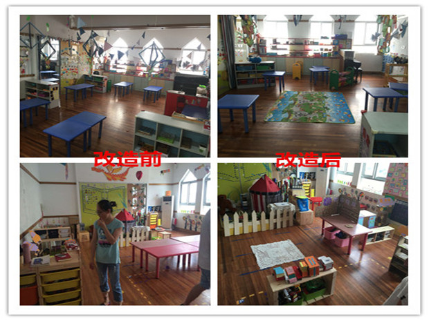 分享引领环节之后,老师们分成两组进教室进行空间改造,大家搬一搬柜子、桌子、钢琴等,充分利用教室里的所有设施进行区域的重新划分。老师们跳出区域空间U字型的传统思维束缚,将桌椅、柜子有机整合,排列出多样组合:T字型、回字型、丁字型、直角型、L型。改造后的教室,让人耳目一新,夺人眼球。