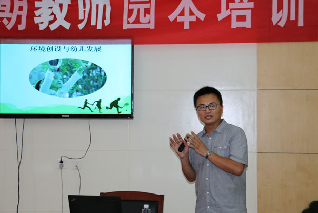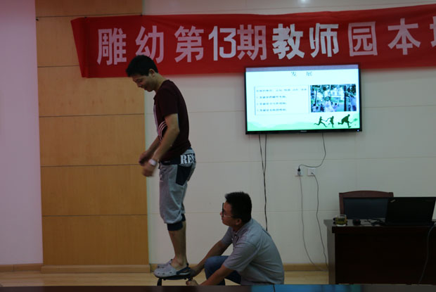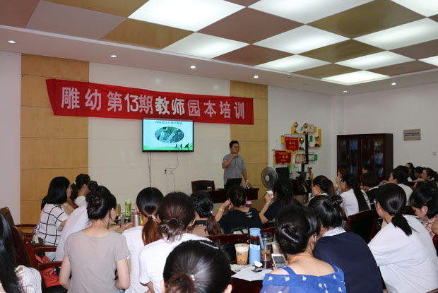 环境是支持幼儿学习与发展的教育关键因素之一,游戏环境能直接映射一所幼儿园的课程理念。在课程游戏化实施背景下,我们应该结合课程实施的需要,适时、动态地对幼儿的活动环境进行改造、调整,从室内环境到室外环境,从显性环境到隐性环境,从而积极营造支持幼儿学习与发展的物化环境,保障幼儿全面发展。雕幼本着因地制宜、创设良好的户外环境为宗旨,通过不断的实践与研究,在创设户外运动环境方面取得一定的成果。为进一步明确其目标和优化操作路径,我园在暑期园本培训时特邀请了王彦(常州市银河幼儿园副园长,著名幼儿男教师,江苏省“幼儿体育”学科带头人),对全体老师们进行了一次全面的培训,帮助大家更新观念、提高认识。