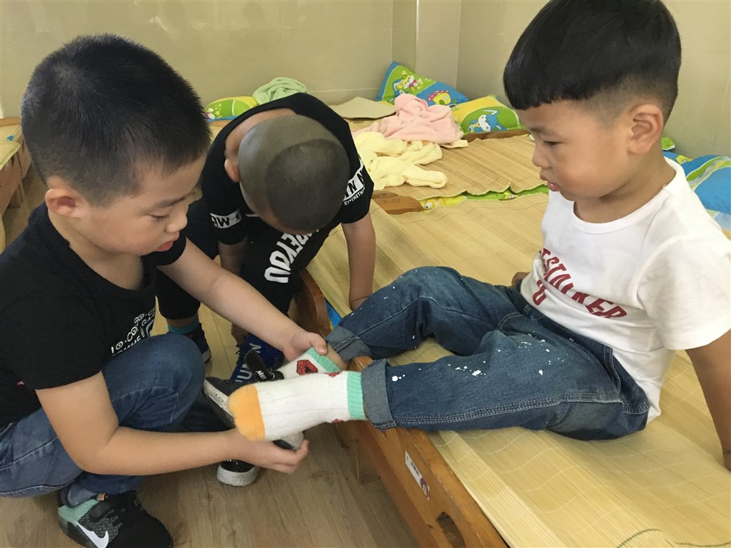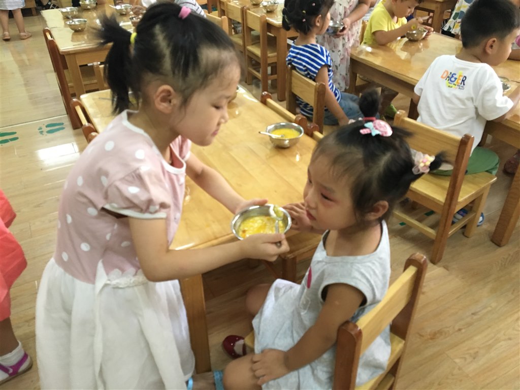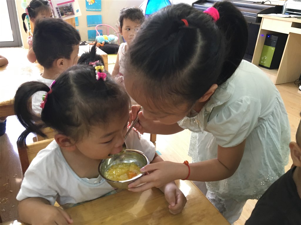 在大孩子与小孩子相处的过程中,大班的孩子懂得了主动去帮助弟弟妹妹,如穿袜子、穿鞋子、提裤子,懂得了积极地去关心弟弟妹妹,看见小妹妹摔倒在地上会主动的上前扶起来,看见小弟弟哭了,学着扮鬼脸把他们逗乐。