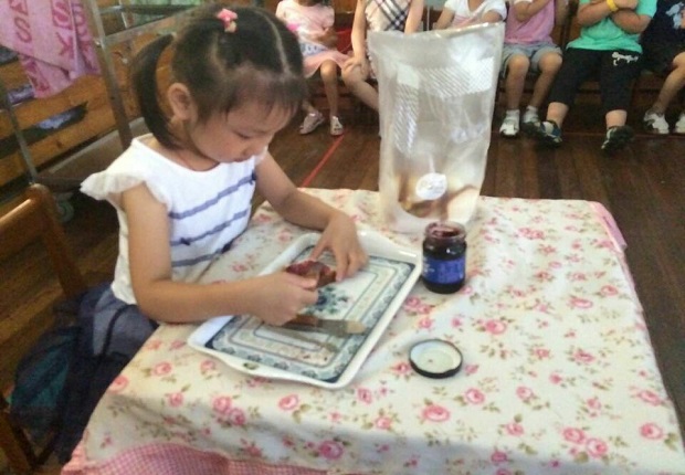 工作开始了,老师首先拿出了面包,蓝莓酱,餐盘还有餐刀,很显然,我们要完成的就是涂抹果酱的工作。在老师的示范下,小朋友知道了要先用餐刀蘸取一些蓝莓酱,然后把果酱用餐刀均匀地涂抹在面包上,要注意不能涂到外面,最后要把涂好果酱的面包放回餐盘。因为小朋友在工作中表现的都很棒,老师决定请小朋友品尝一下自己动手涂好果酱的面包,在分发面包的过程中,小朋友也学会了分享与等待。