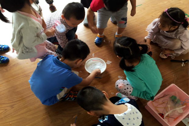 本次活动,老师组织幼儿进行吹泡泡活动,既发展了幼儿的观察能力、动手能力和想象能力,又增加了幼儿在园乐趣。吹泡泡是幼儿非常喜欢的一项游戏,在幼儿自己喜欢的游戏中探究,发现,让每个孩子体验成功吹出泡泡的神奇与喜悦。使幼儿感到科学活动不再枯燥。